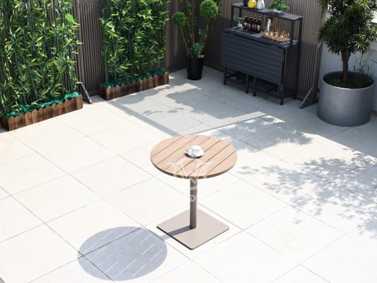Mesa de comedor redonda con marco de aluminio y tapa de madera de plástico