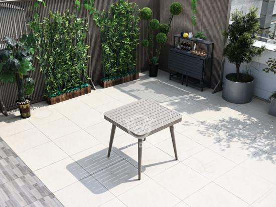 ElMesa de comedor cuadrada con tablero de listones de aluminioEs la fusión perfecta de elegancia y encanto informal, ideal para cenas al aire libre. Diseñada para impresionar, esta mesa cuenta con un tablero de aluminio que irradia sofisticación, mientras que su diseño de listones mejora la circulación del aire y crea una atmósfera relajada. Las elegantes patas y estructura de aluminio crean un impactante contraste visual, convirtiendo esta pieza en la pieza central de sus reuniones al aire libre.